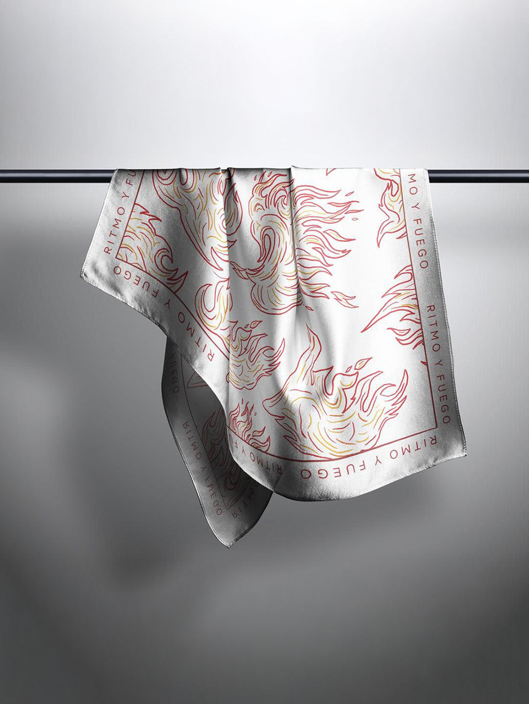Una pieza que arde con elegancia. Este pañuelo de seda satinada celebra la energía vital que nos mueve: el fuego del cuerpo y el ritmo del alma. Con ilustraciones en rojo y dorado sobre fondo claro, es ideal para llevar en el cuello, el cabello o como símbolo de fuerza creativa. Para quienes viven encendidos por dentro.