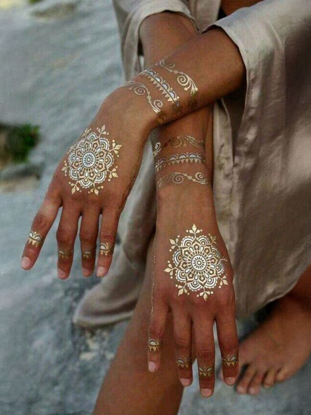 Diseños inspirados en la naturaleza sagrada y el arte ancestral. Estos tatuajes temporales, en tonos dorados y blancos, se adhieren como joyas sobre la piel. Perfectos para rituales, festivales o simplemente para conectar con tu poder interior. Resplandecen con el sol y el alma.